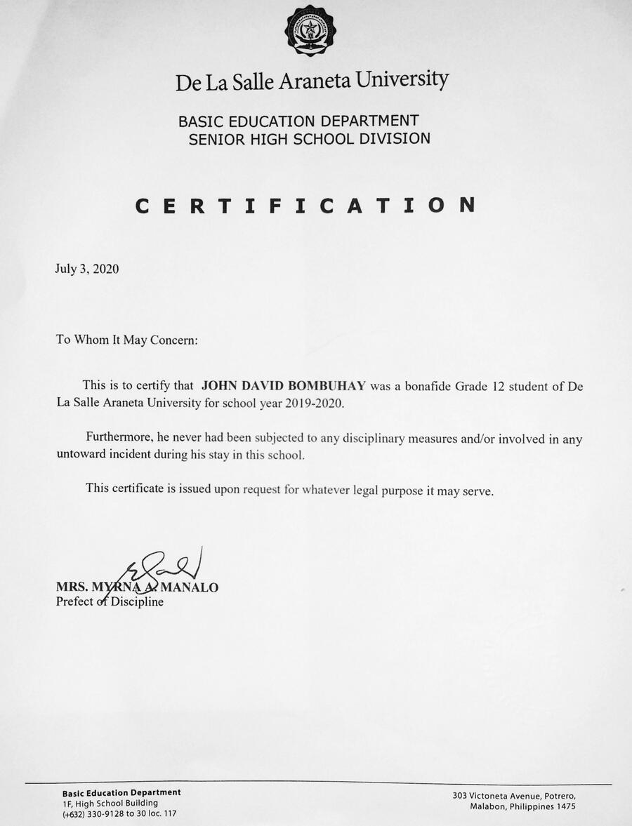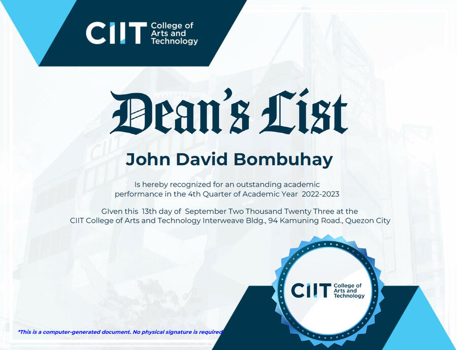 The certificate is specially conferred upon John David Bombuhay in acknowledgment of his remarkable academic performance, signifying his eighth time being recognized as a Dean's List awardee at the university.
