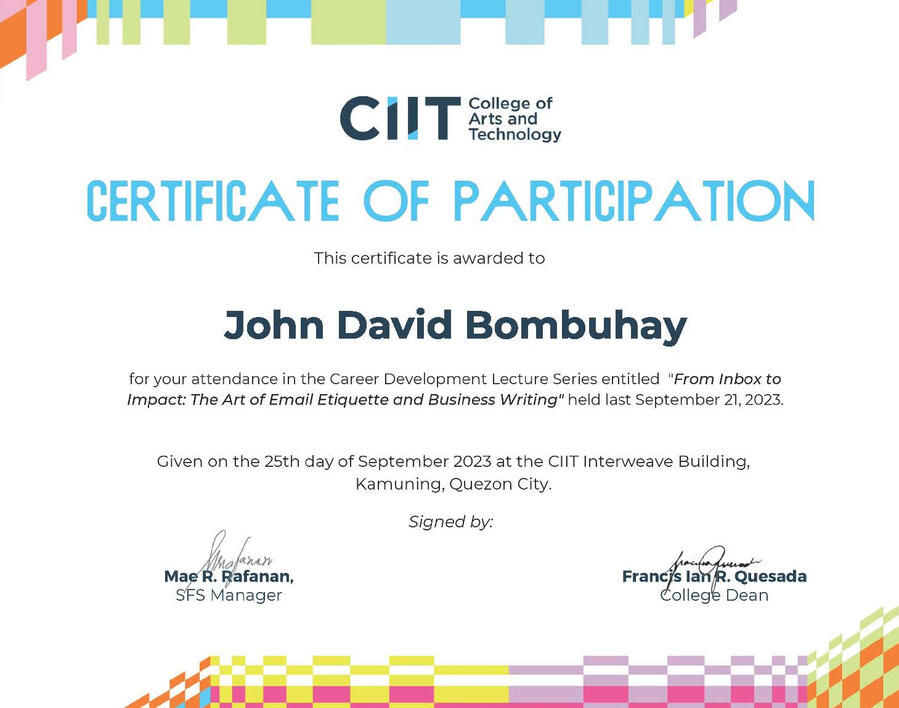 The certificate acknowledges the participation in the Career Development Lecture Series, where the individual was urged to improve their business writing skills and understand the role of email etiquette in achieving success in their career. The series provided valuable insights and strategies for enhancing professional communication skills and gaining a competitive edge in one's chosen field.